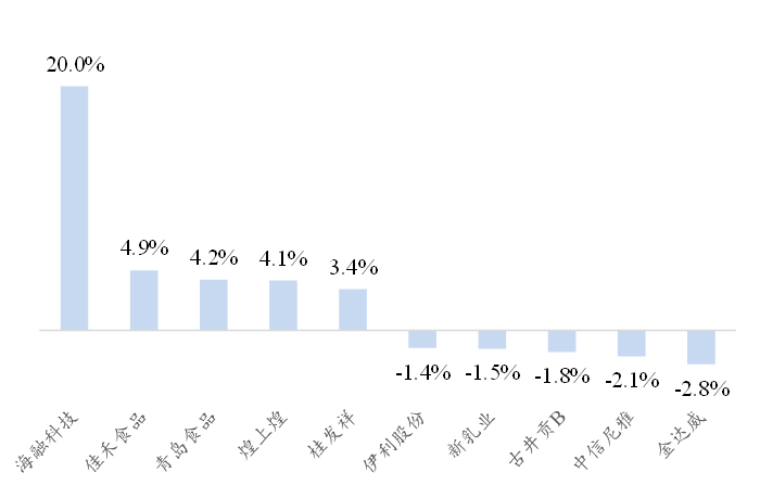 2、食品饮料板块中,烘焙食品(+1.0%)、零食(+0.8%)、软饮料(+0.3%)表现相对靠前。海融科技、佳禾食品、青岛食品涨幅领先。